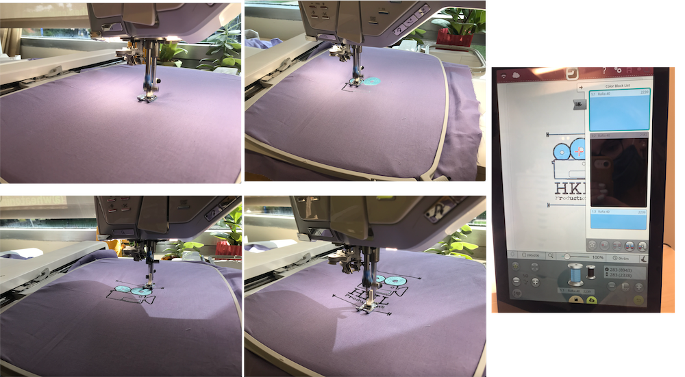 During my training, I embroidered my logo on to a piece of fabric! I uploaded my png design to Premier+, which scanned my file and predicted how it would look embrodiered as well as told me how many different string colors I would need. The initial scan told me 10 colors - but I narrowed it down to 2. Next, from Premier+, I sent my file to the machine. The machine itself has a bounty of designs and texts that you can use right from the machine! It took me a few tries to get my top thread correctly in the machine, but eventually got the hang of it! For my thread and bobbin, I used a pretty light blue shade, and then black for the line work and text. It was impressive watching the machine go to work! I only had to change the string color once, and otherwise I just sat back and watched the machine do its thing!