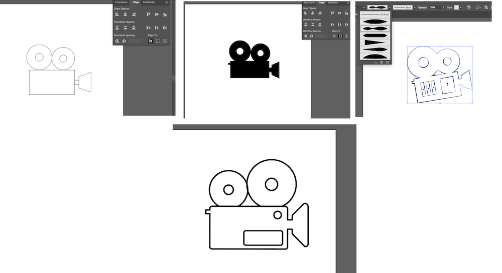 I sketched out a few ideas for different film related icons, using Google as a reference, and settled with a video camera. I did a very basic shape then experimented with a few different line shapes. I tried out a couple of different designs, and finally narrowed it down to two. I then added color-- blue is my favorite color!--and two bars to act as framing elements.