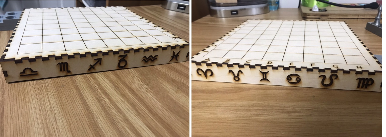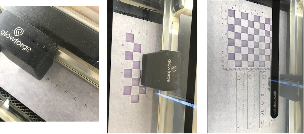 I cut the acrylic board using the Glowforge laser cutter. THe only tweaks I made from my previous design were increasing the width of the material to 3.45mm and increasing the heigh of the sides a bit to make the board taller. The engraving of the checkerboard took an hour of painstaking waiting, but the result was worth it!