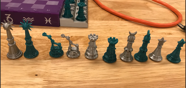 My next steps are to finish up the piece holder design - I plan to add some designs on the bottom of the slots to specify where each piece goes - then print it, as well as begin printing more pieces. Additionally, I plan to