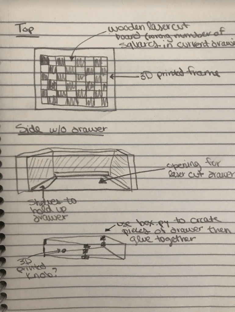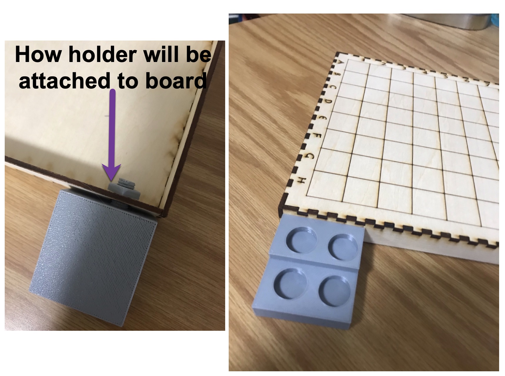 the printers in the Fab Lab. So - instead I will be creating a box element with a checkboard on top using the Glowforge, and creating 3D printed piece holders that are secured to the board. My current plan for securing
