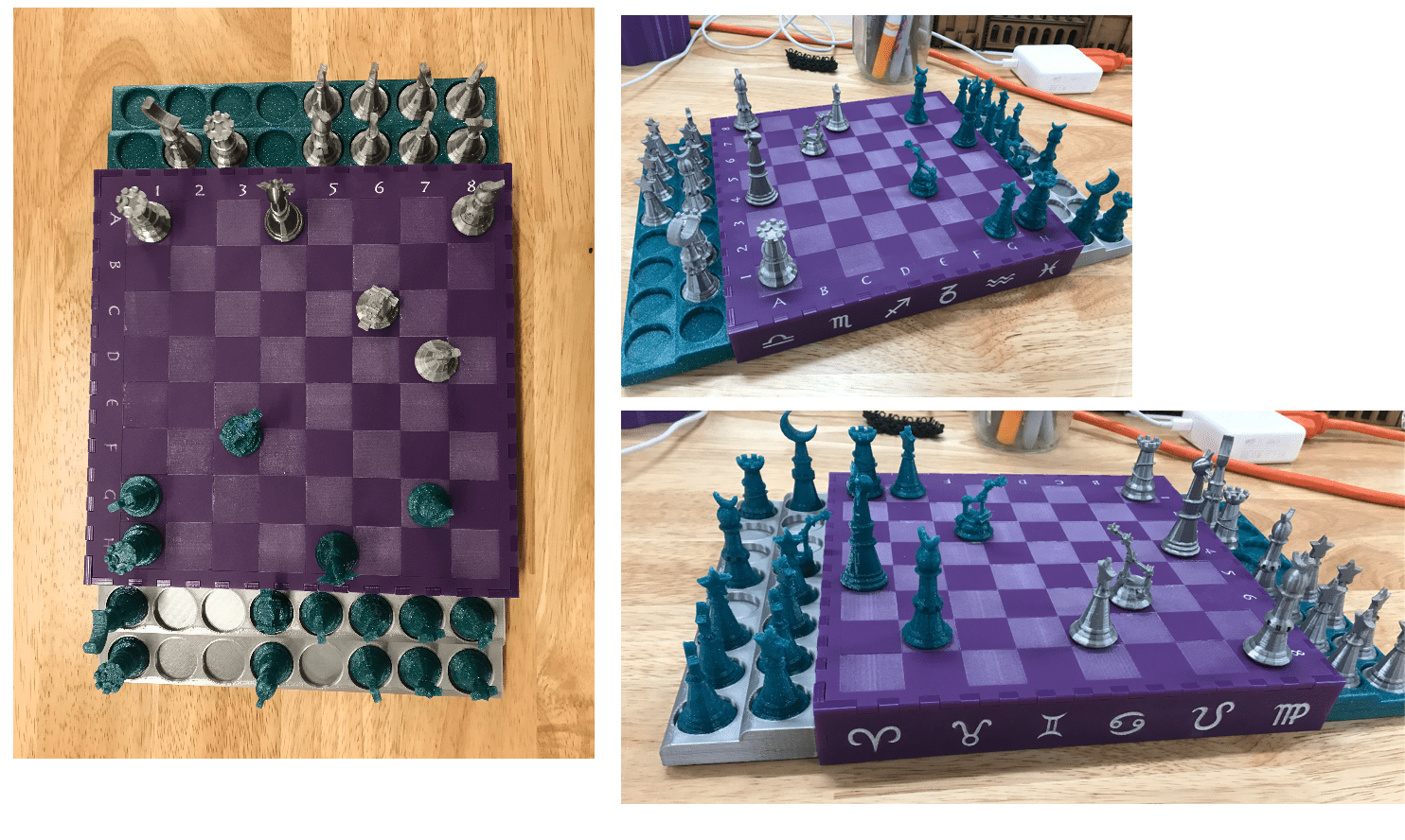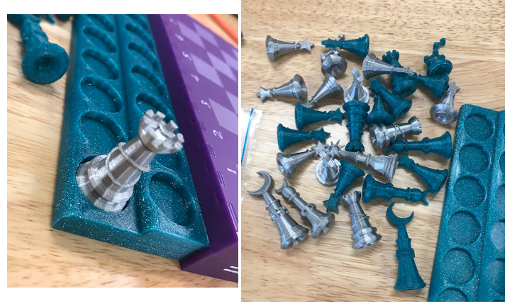 Next week, I will print out the rest of the pieces using silver and sparkly blue PLA as well as laser cut the board into purple opaque acrylic!
