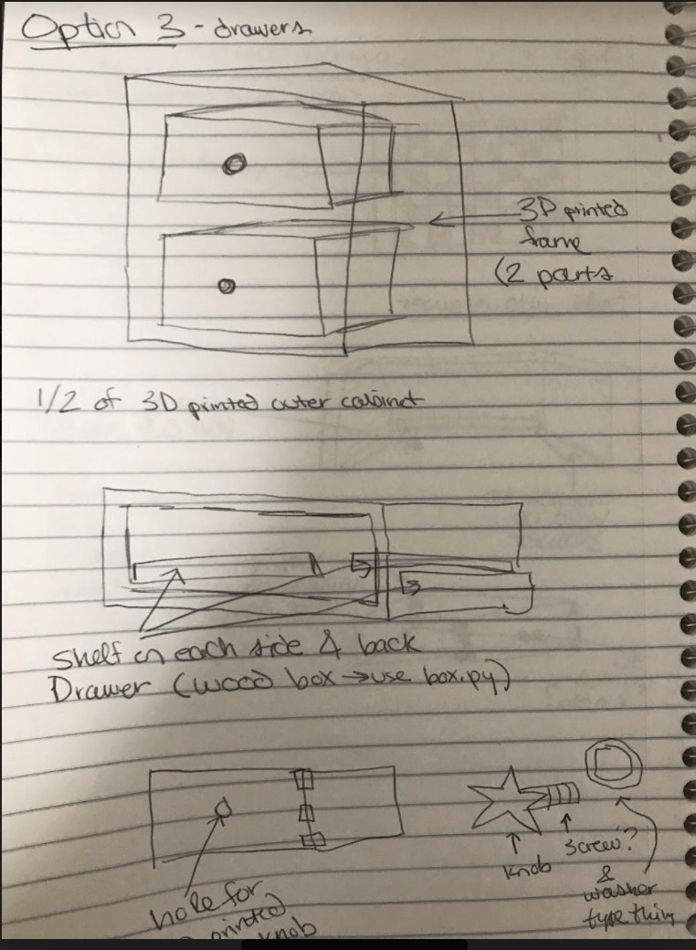 My third - and simplest - idea is a desk top organizer with working drawers. The components would include a two pieces of a 3D frame that would be secured together, laser cut boxes for the drawers, and 3D printed knobs.