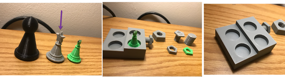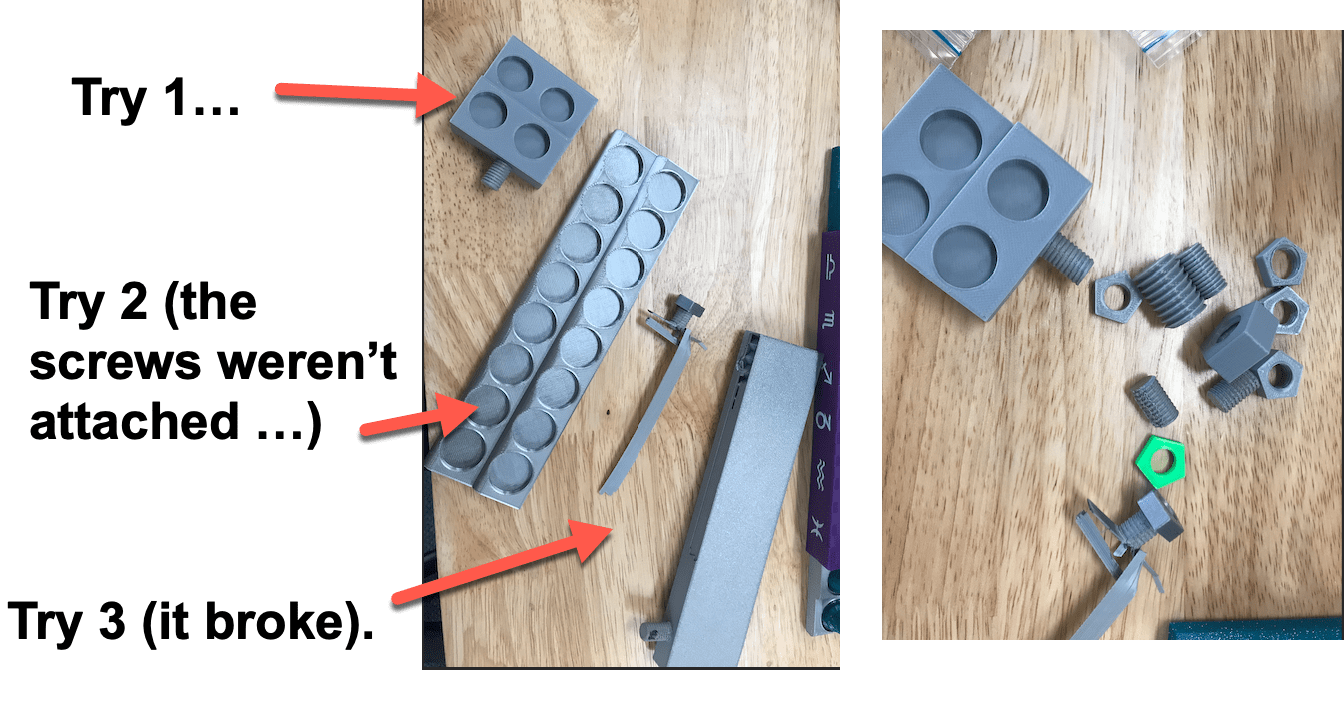 After lots of trial and error, with my threaded peices, I was finally able to get the piece holders properly attached to the board and could put everything together! Below are some images of my holder and (many) screw iterations and prototypes!