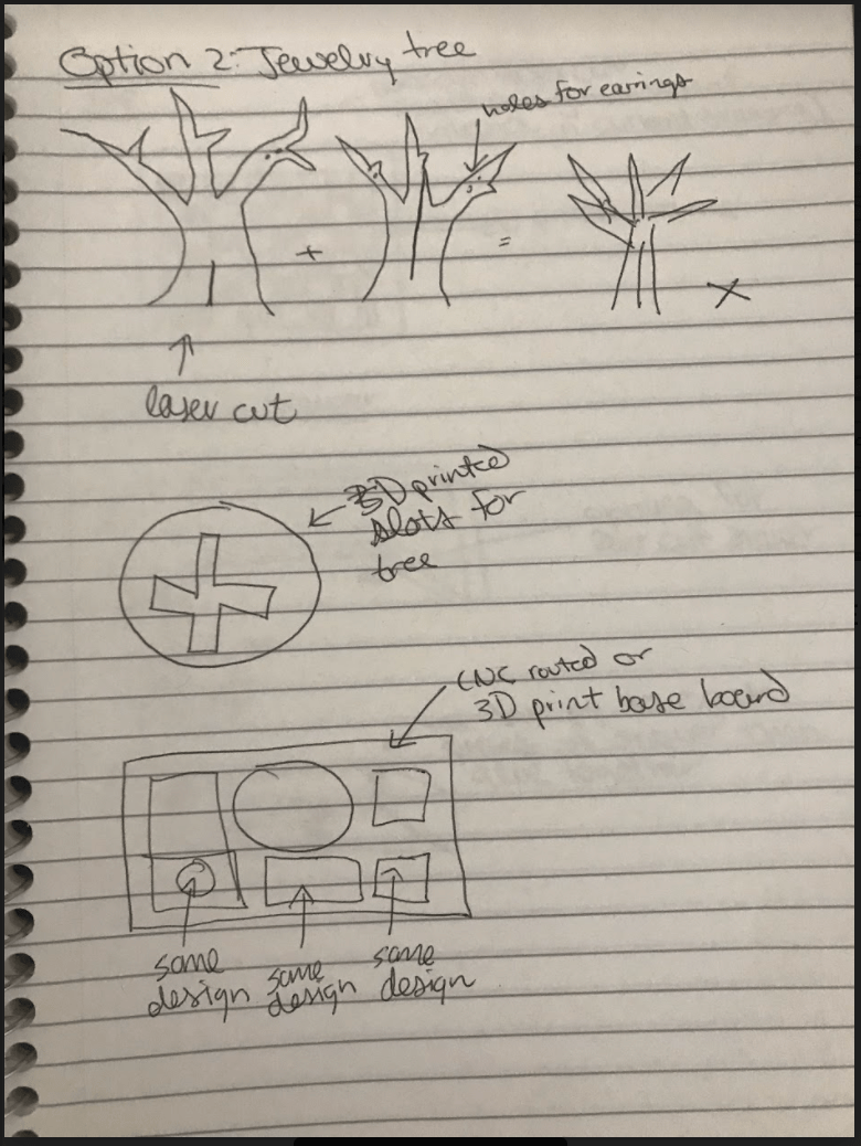 My second - and slightly less involved - idea is a Jewelry tree and custom base. The components would include a laser cut 3D tree with holes and hooks, and a 3D printed base with slots for other jewelry and an "x" slot to hold the tree.