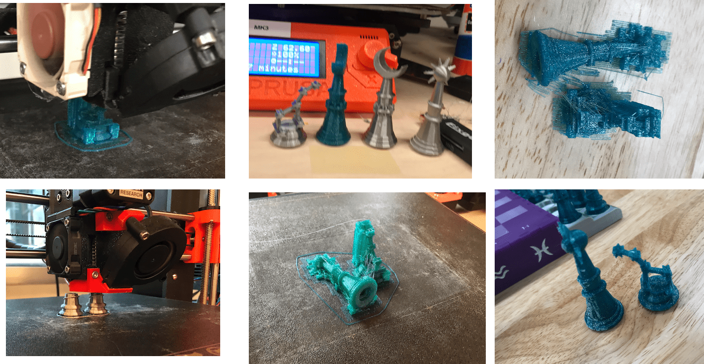 It took me two and a half weeks to print all 32 pieces. Only the knight and the king required supports, and other than the intial design of the pawn, the printing went very smoothly! I did find that the blue sparkly PLA was far more stringy than the silver, which made removing the supports and cleaning up the excess strands trickier.