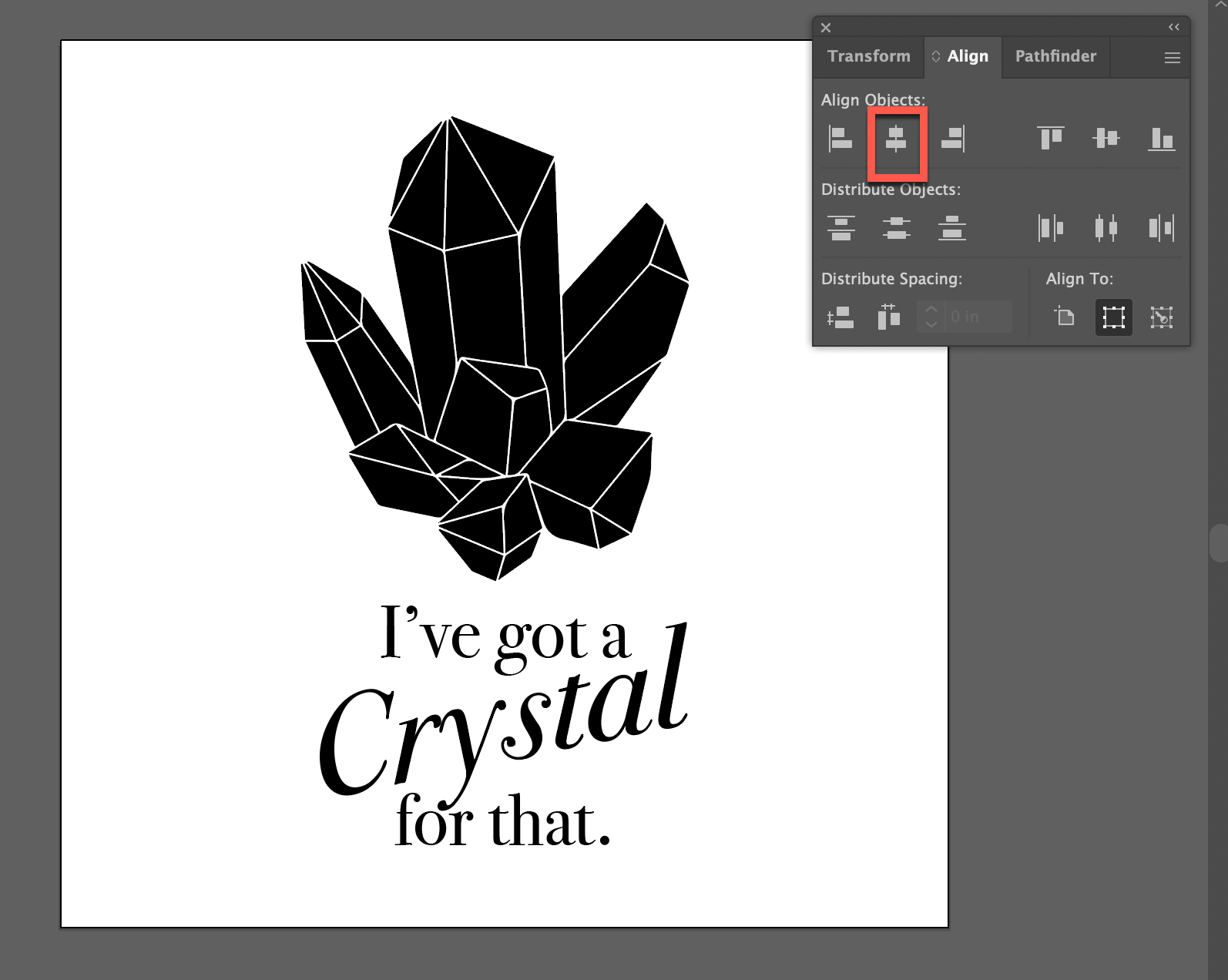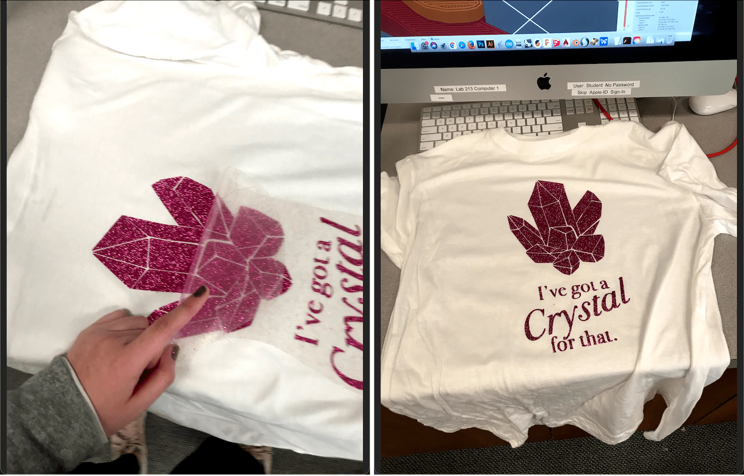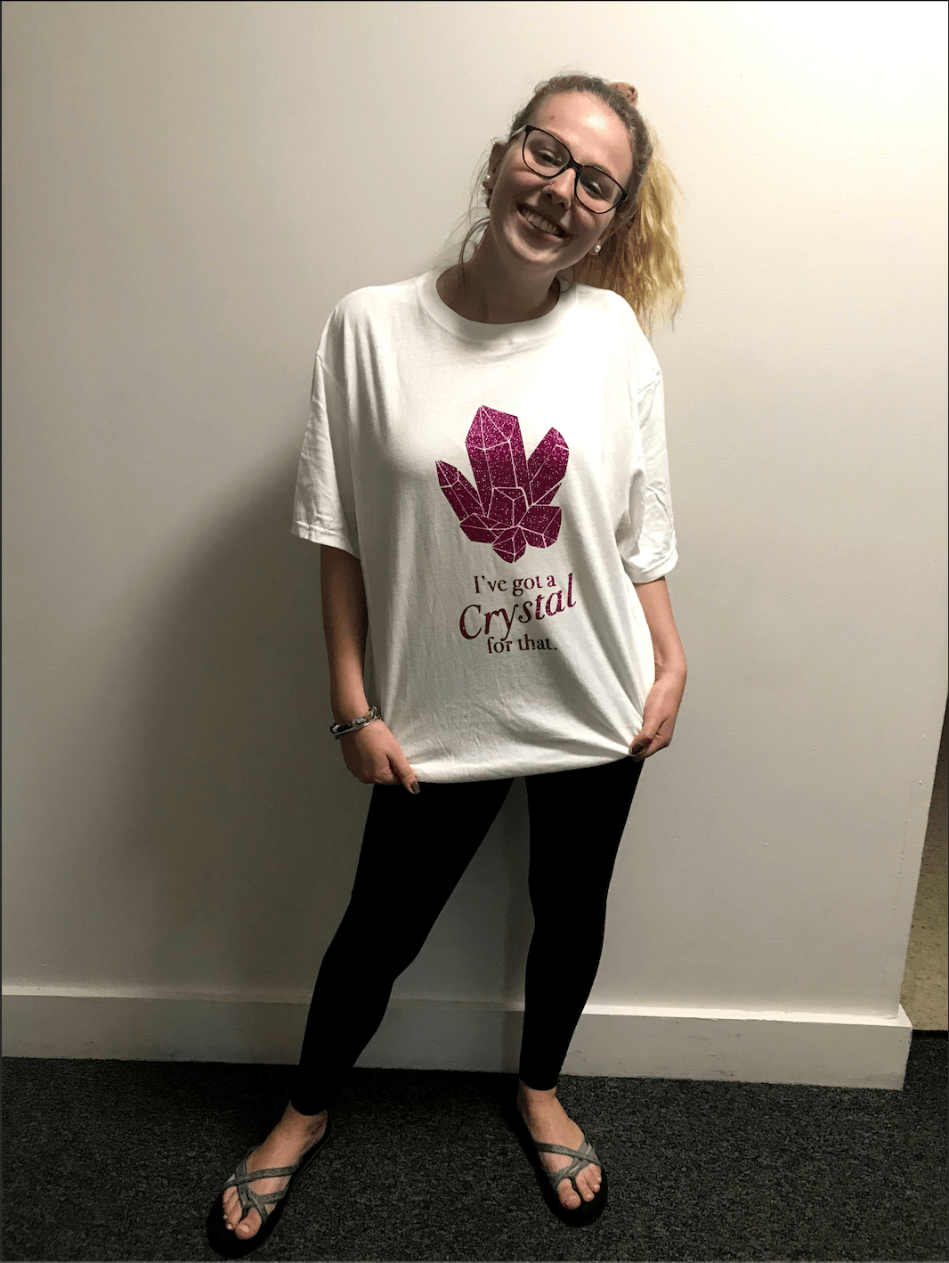 I made my design using Adobe Illustrator. After running through a bunch of ideas, I settled with the quote "I have a crystal for that" with a sinmple gemstone graphic.I am a huge lover of crystals, and a strong believer in their metaphysical powers! I saw this quote on Instagram and loved it.