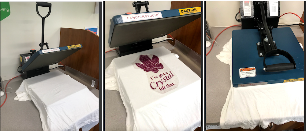 After finishing weeding, I turned on the heatpress. Once it reached 371 degrees F, I placed the blank shirt and pre-warmed it for 5 seconds. Next I placed the vinyl sticky side down onto the shirt, and clamped the heat press down for 10 seconds. I held my breath as I removed it, then proceeded to peel away the sticky sheet. Luckily, it came off beautifully!