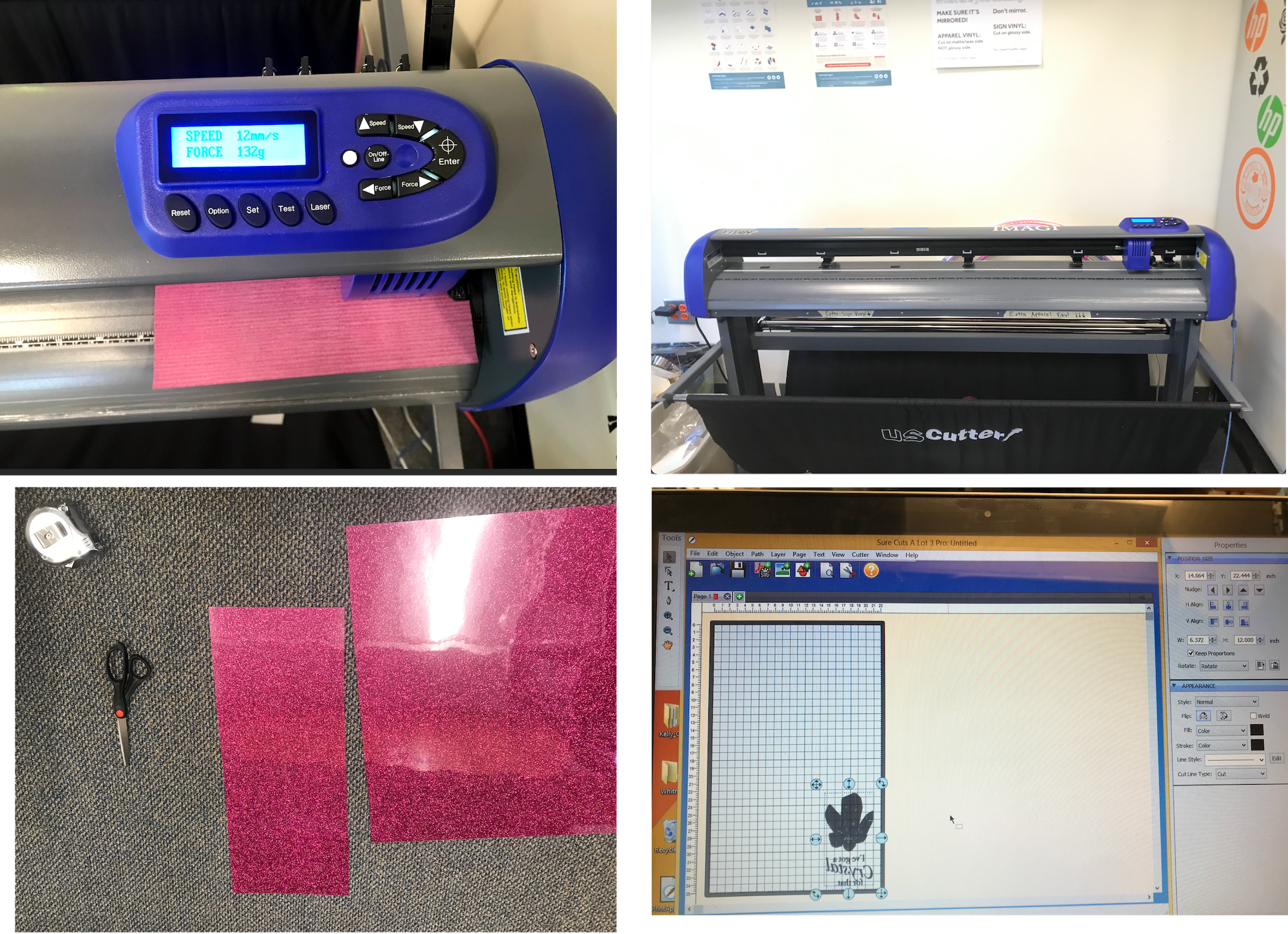 After recieving my training, I was able to book my time on the vinyl cutter to make my shirt graphic. For my vinyl, I picked up a glittery pink color of apparel vinyl and cut a piece from the roll. After loading my sheet of vinyl and setting the speed (12mm/s) and force (135g) of the machine Using the designated computer, I opened my design in Sure Cuts A Lot. I moved the design to the lower corner and double checked the size, making the height 12 inches, and letting the width set automatically based on the proportions. Then I went ahead and sent my design to the machine and watched it cut!