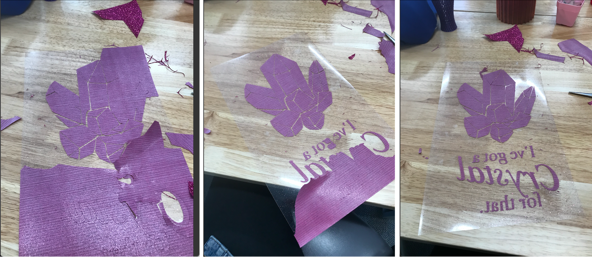 This project was really satisfying! The finished product was a much higher quality than I had expected! My one hang up was using the glitter vinyl as opposed to a normal matte apparel vinyl. The glitter made it much harder to weed, and I had to spend a lot of time carefully peeling away the excess pieces of the design. But I am glad that I stuck with the glitter, as it came out so great!
